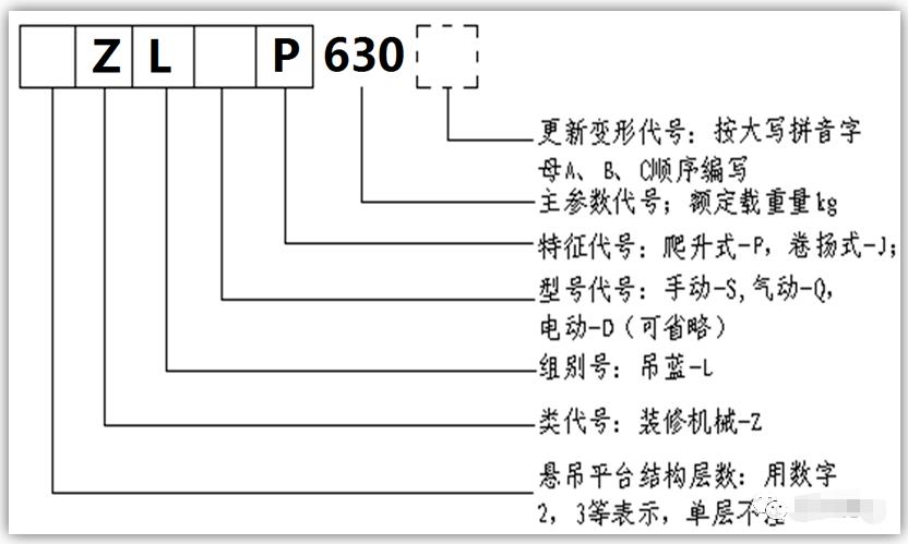 4、高處作業(yè)吊籃型號 高處作業(yè)吊籃型號是由類、組、型代號、特征代號和主要代號及更新型代號組成。