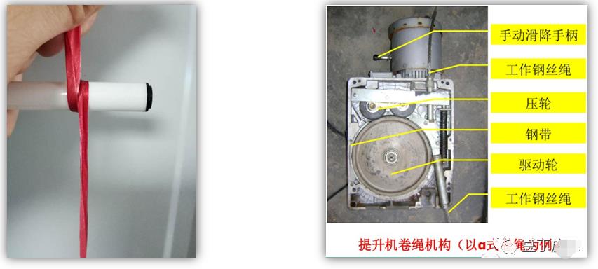 7、高處作業(yè)吊籃工作原理 電動提升機工作原理: 吊籃提升機構(gòu)的基本原理,如同在筆上纏一圈繩后,向上拉緊繩的情況下,旋動筆時,筆會上下移動。 提升機不是收卷或釋放鋼絲繩,而是靠驅(qū)動輪與工作鋼絲繩之間的咬合摩擦,工作時鋼絲繩靜止不動,驅(qū)動輪在其上爬行,從而帶動提升機及懸吊平臺整體提升。