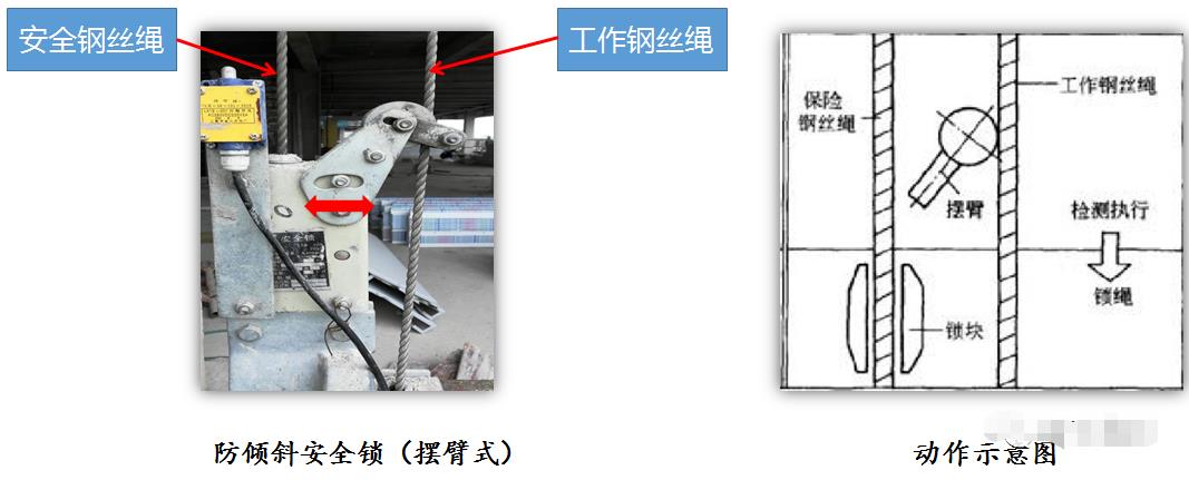 擺臂防傾式:具有鎖繩角度探測機構(gòu),當?shù)趸@發(fā)生傾斜或工作繩斷裂、松弛時,其鎖繩角度探測機構(gòu)即發(fā)生角度位置變化,帶動執(zhí)行元件使鎖繩機構(gòu)動作,將吊籃鎖住。