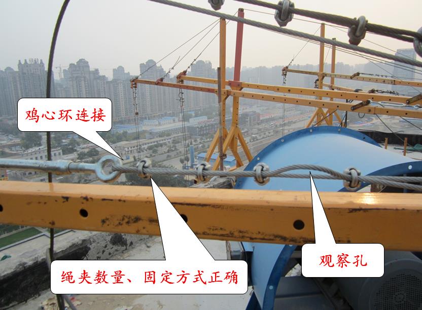 吊籃鋼絲繩端固定繩夾數(shù)量最少3只(在鋼絲繩公稱直徑dr≤18mm時,具體數(shù)量可查閱規(guī)范),U形螺栓扣在鋼絲繩的尾段上,繩夾不得交替布置。鋼絲繩在做回彎時,必須使用雞心環(huán)保護使其圓滑過渡。