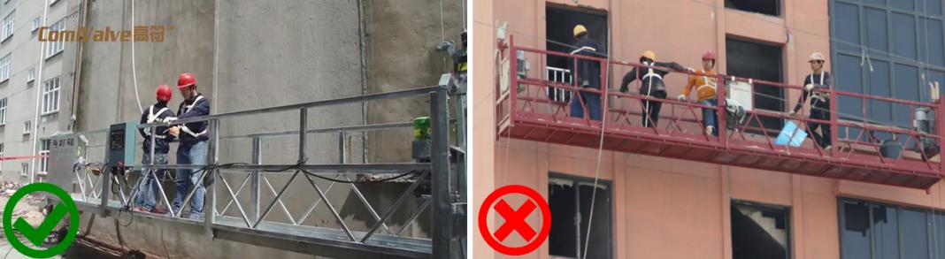 吊籃內(nèi)的作業(yè)人員不應(yīng)超過 2 人,吊籃內(nèi)作業(yè)人員應(yīng)將安全帶用安全鎖扣正確掛置在獨立設(shè)置的專用安全繩上。